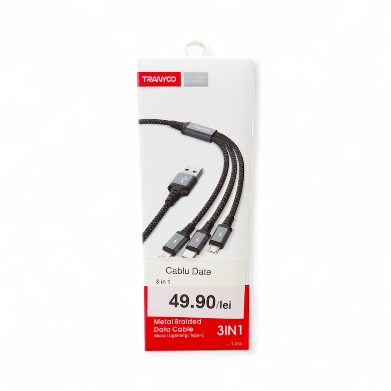 Cablu date USB → Lightning & Type-C & Micro-USB, Tranyoo 2.1A, model T-XS6, lungime 1.2 metri.