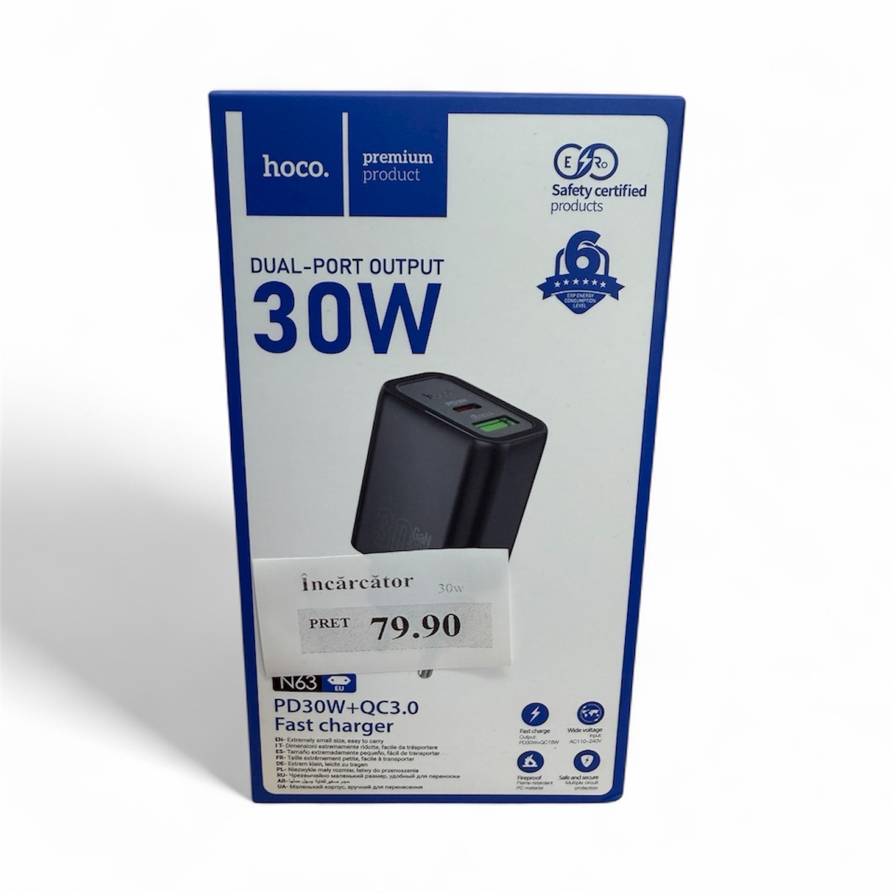 **Hoco N63** este un incarcator de retea modern, cu **putere de 30W**, ideal pentru utilizatorii de iPhone si nu numai. Vine echipat cu **porturi USB-A si USB-C**, dar si cu un **cablu Type-C la Lightning** inclus, ceea ce il face solutia completa pentru incarcare rapida acasa sau la birou.