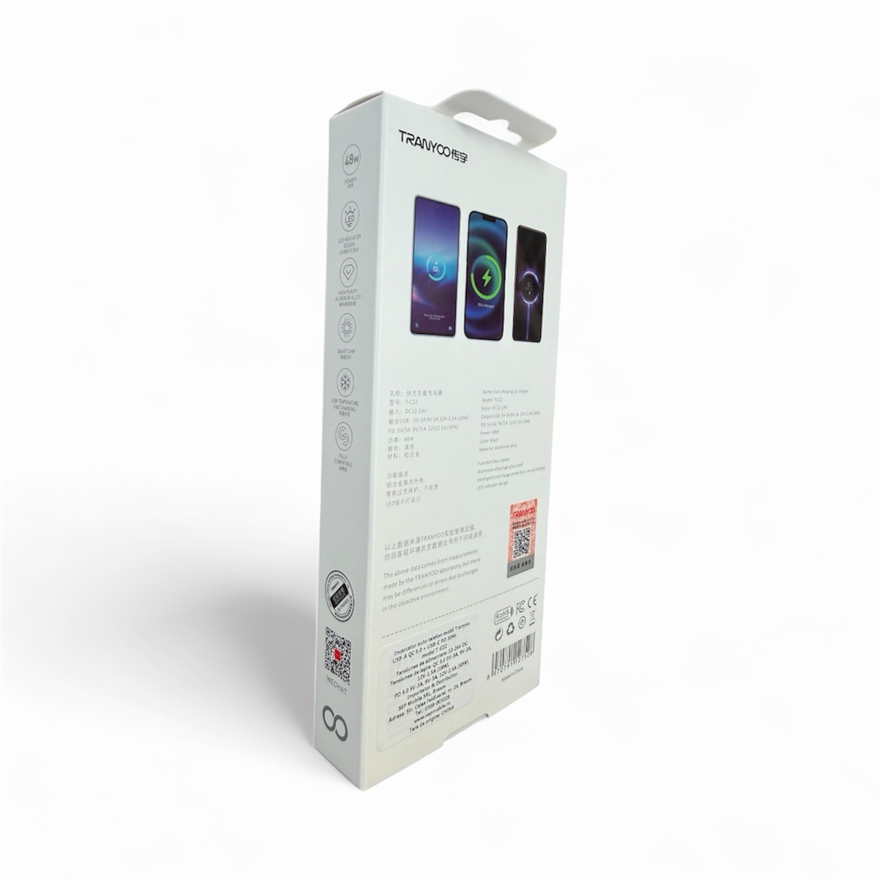 Adaptor auto telefon mobil USB-A QC 5.0 + USB-C PD 30W, Tranyoo model T-C22 48W, carcasa din aluminiu ce ofera un design inedit si incarcare rapida, indicator LED.